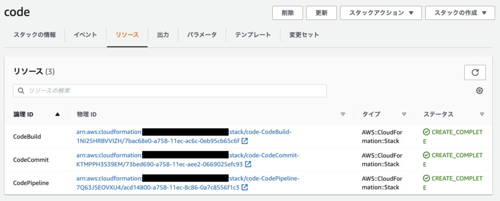 code.yml からスタックを作成します。スタックの作成が成功すると、CodeCommit、CodeBuild、CodePipeline が作成できました。