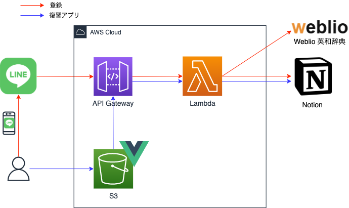 以前の記事で、LINE、AWS、Notion API を利用して、英単語を検索して意味をノートにメモする作業を自動化しました。これを利用して登録した単語を復習するために、Vue.js を使用したアプリケーションを作成したので、その手順についてまとめます。