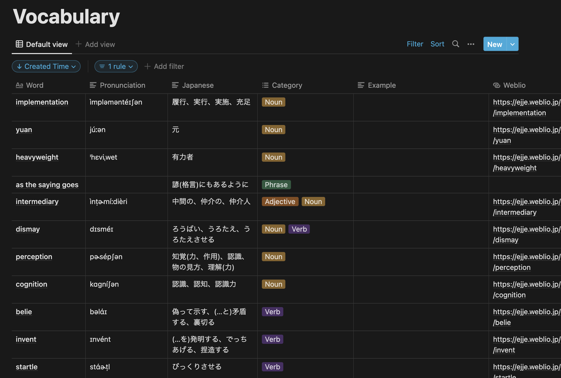 現在、Notion のデータベースには以下のように英単語が登録されています。
