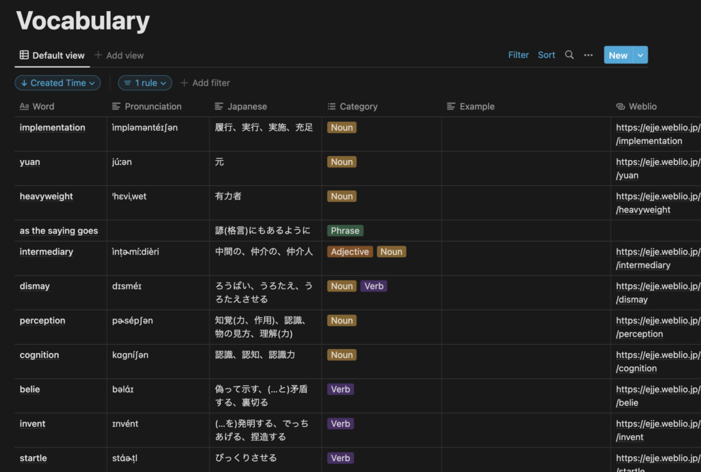 現在、Notion のデータベースには以下のように英単語が登録されています。 この状態のまま眺めていても覚えているかの確認ができないため、一問一答形式で勉強できるようにします。