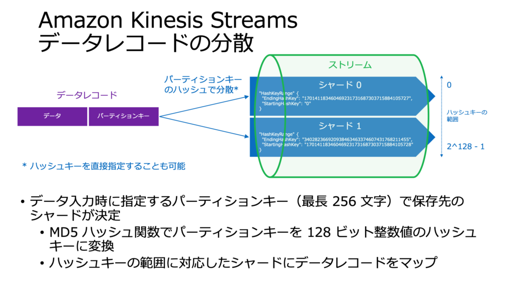 パーティションキーを使用して、データレコードを格納するシャードが決定されます。そのためパーティションキーに偏りが生じると、ホットシャードにつながり性能低下を招く可能性があります。
