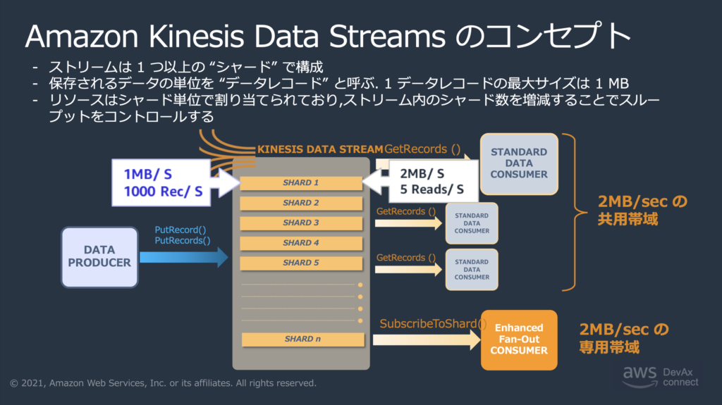 データストリームを構成する単位で、データストリームの読み込み・書き込み性能はシャード数によって決まります。プロビジョニングモードを使用する場合、必要な性能に応じてリシャーディングを行い、適切にシャード数を保つことが必要になる。