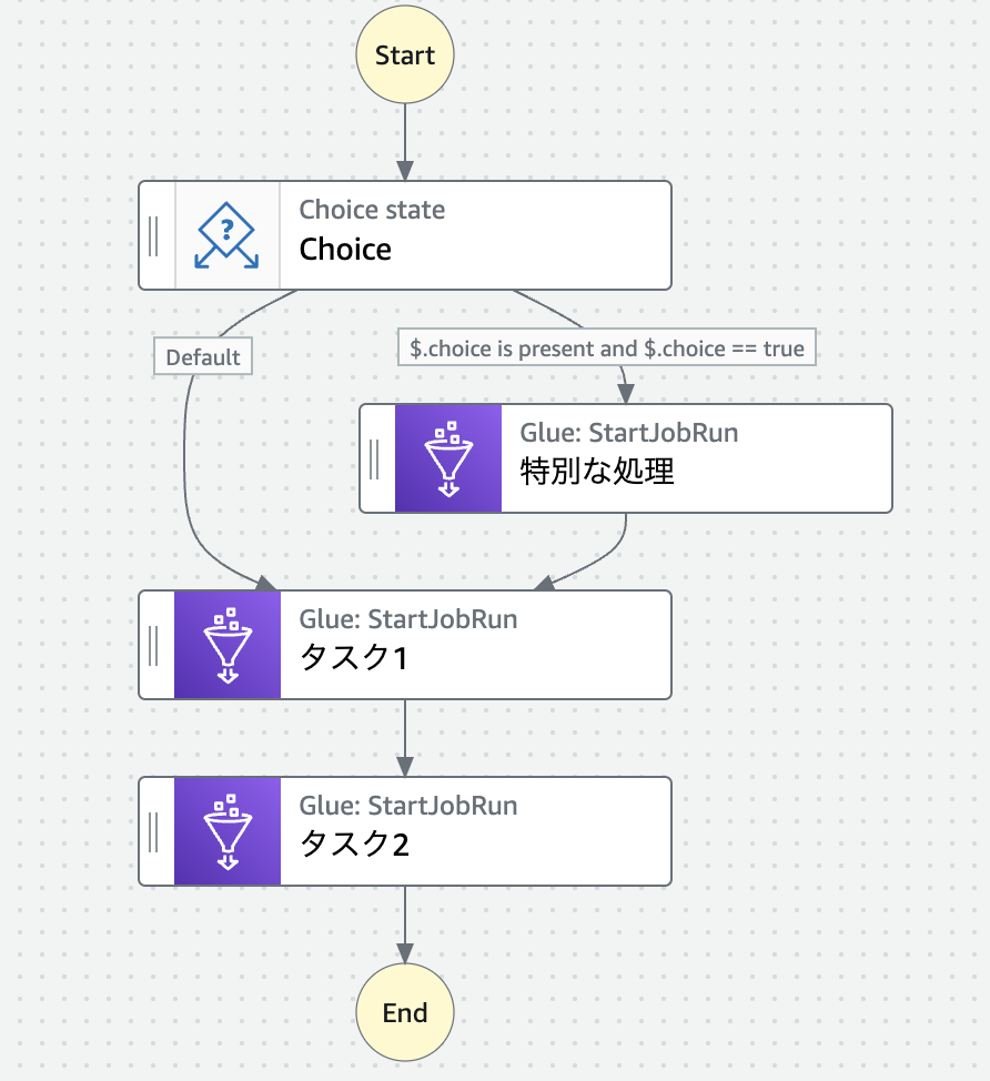 ポイントは Choice ステート内で IsPresent を使用している点です。これにより存在しない変数にアクセスした際のエラーを防ぐことができます。