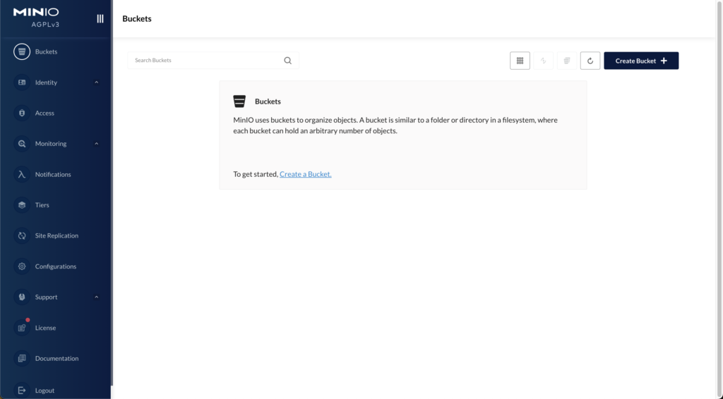 MinIO を立ち上げます。localhost の8080ポートにアクセスすることで GUI でストレージを確認することができます。